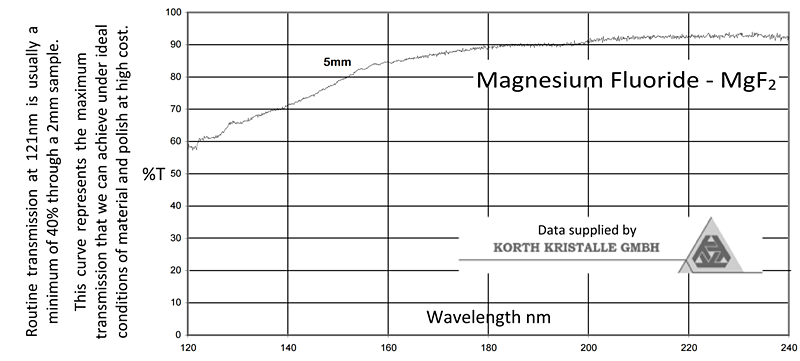 MgF2能很好地透过VUV区域到莱曼-阿尔法氢线(121nm)甚至更远。氟化镁主要用于UV光谱,并且对于准分子激光具有很好的应用。MgF2通过真空Stockbarger技术在各种直径的铸块中生长。 氟化镁是一种坚韧的材料,并且抛光良好。 因此,它可以工作到高标准。 MgF2具有微弱的双折射性质,并且通常提供垂直于窗面切割的光轴。
