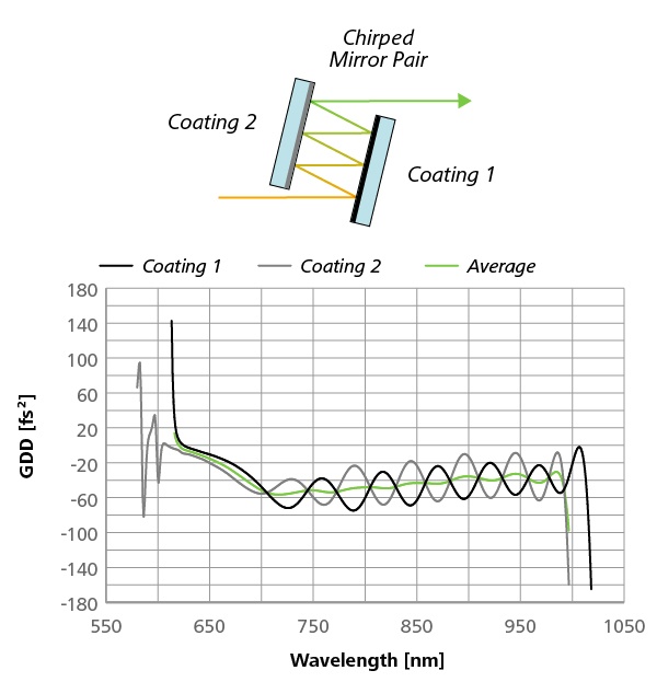 可以通过使用相应的镜对来实现校正。它们由两个具有相反 GDD 曲线的不同涂层介电镜组成,激光束可以根据需要在两个镜之间来回反射(见图)。这些镜子针对小入射角进行了优化,从而可以实现大量反射。