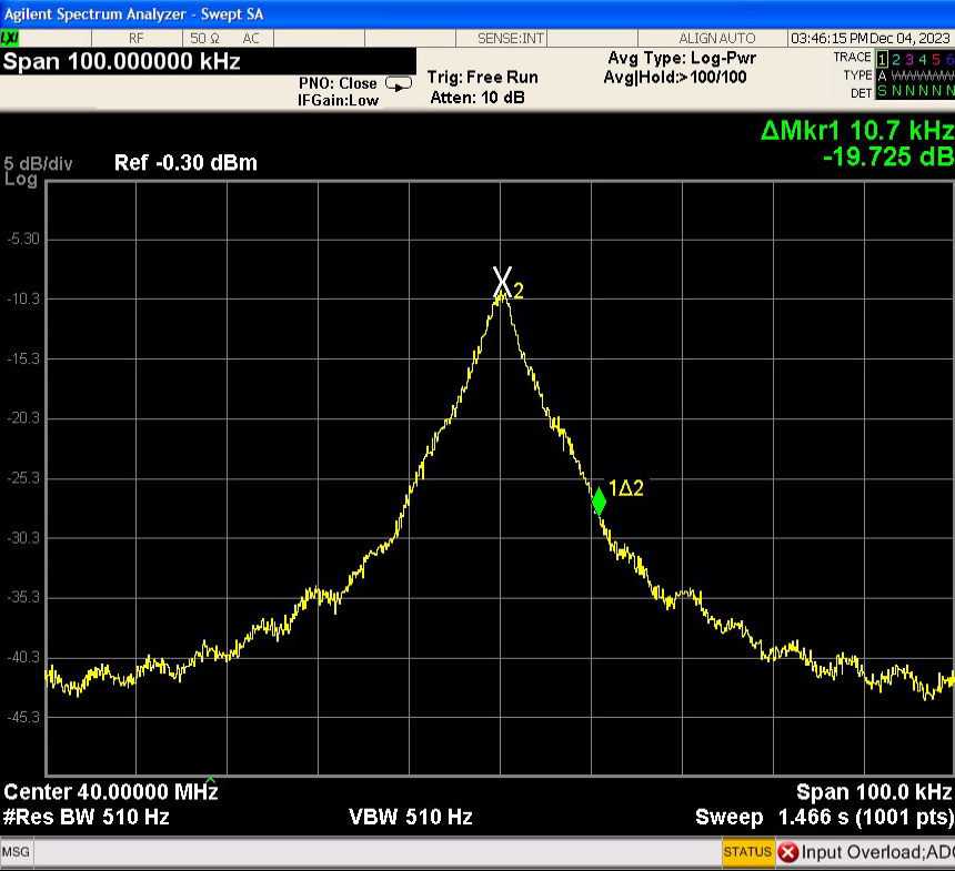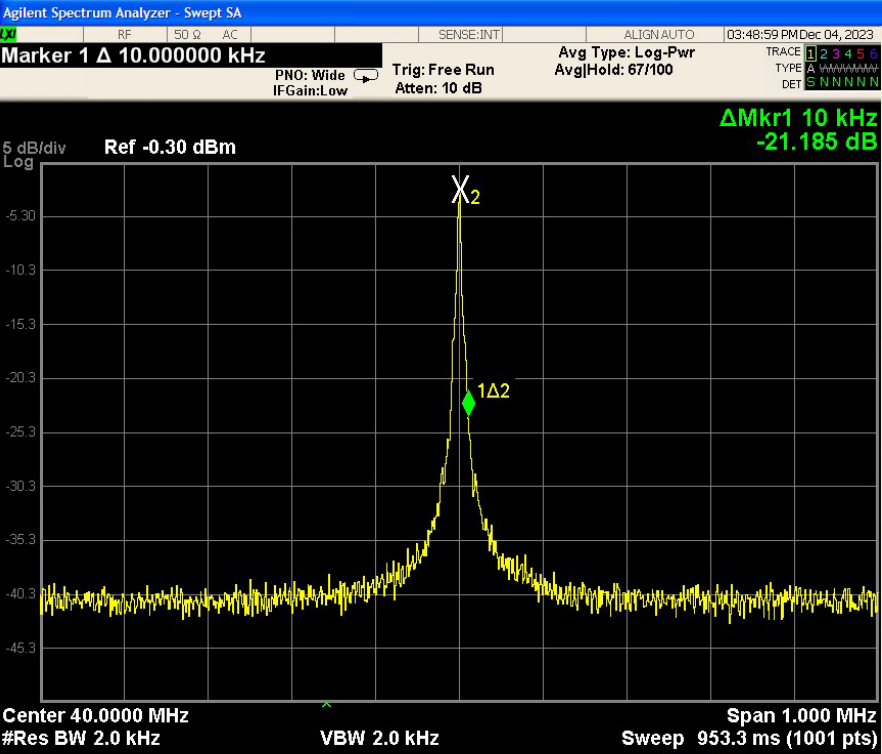 频谱分析仪绘制了使用 35Km 延迟的激光自外差信号图。 假设洛伦兹线,激光线宽将是单侧 -20dB 线宽的十分之一或大约 1KHz,如图所示。 即使在 35Km 后仍可通过图 2 中的波纹看出相干性