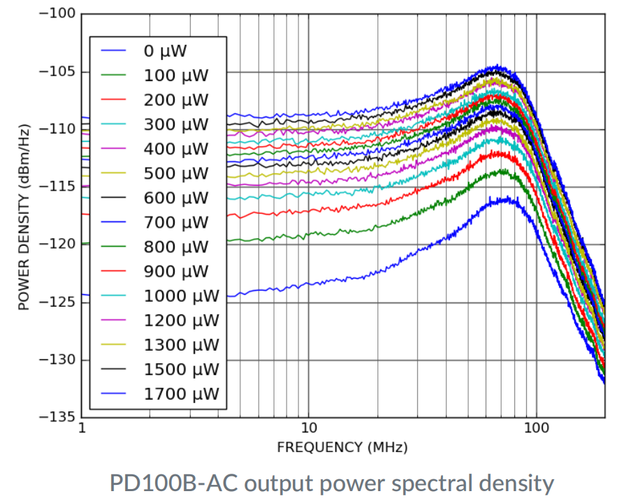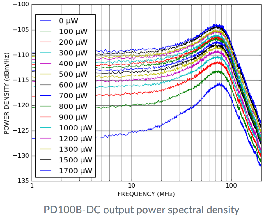 针对不同的入射光功率测量了 PD100B 输出的功率谱密度。指示功率是每个光电二极管的入射功率。光源为Koheron LD100 激光器,波长为 1550 nm。