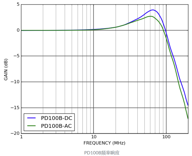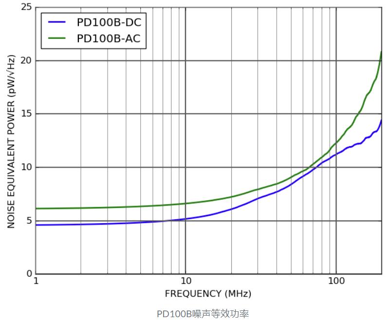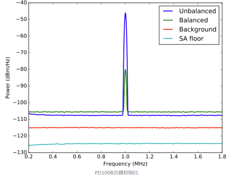 正确平衡后,PD100B 在 1 MHz 时的共模抑制比 (CMRR) 为 35 dB。为了Max. 化 CMRR,不仅要注意平衡光功率,还要注意两个通道之间的路径长度。