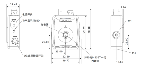 PDJAF8J015 | A80153442 | 800-1700nm铟镓砷放大光电探测器,感光尺寸Φ150um,固定增益5×104 V/A,带宽范围DC~380MHz,快速弱光测量 |