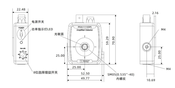 PDJAA8J80 | A80153450 | 800-1700nm铟镓砷放大光电探测器,感光尺寸Φ8.0mm,0~70dB八档定量可调增益,带宽范围DC~100kHz |