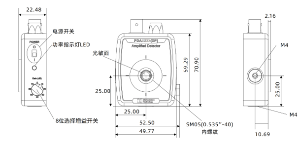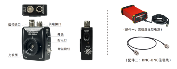 供电接口 | 供电开关 | 信号接口 | 增益调节 | 支杆接口 | 光学接口 | ||