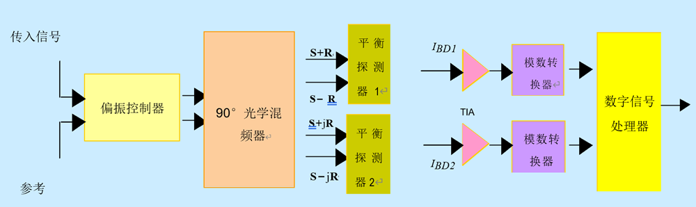 我们的六端口 90° 光学混频器用于光相干检测,包括 QPSK 接收器,它将输入信号与参考信号混合,在复场空间中生成四个正交状态。然后,光学混频器将四个光信号传送到两对平衡检测器。请参阅下面的框图,了解 90° 光学混频器在相干接收器中的应用。