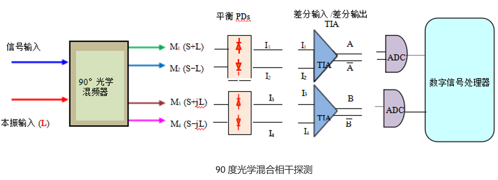 假设 S 和 L 之间的相位差为 φ,通过一对平衡光电二极管进行平衡检测,平衡 PD 的四个输出(强度)为