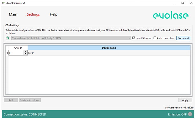 7. 该软件有很多用于连接和控制设备的通道。要连接新驱动器,请单击“添加”,在出现的行中输入驱动器的 CAN ID。您可以重命名驱动程序以便更好地跟踪它们。单击“应用”以应用系统配置。