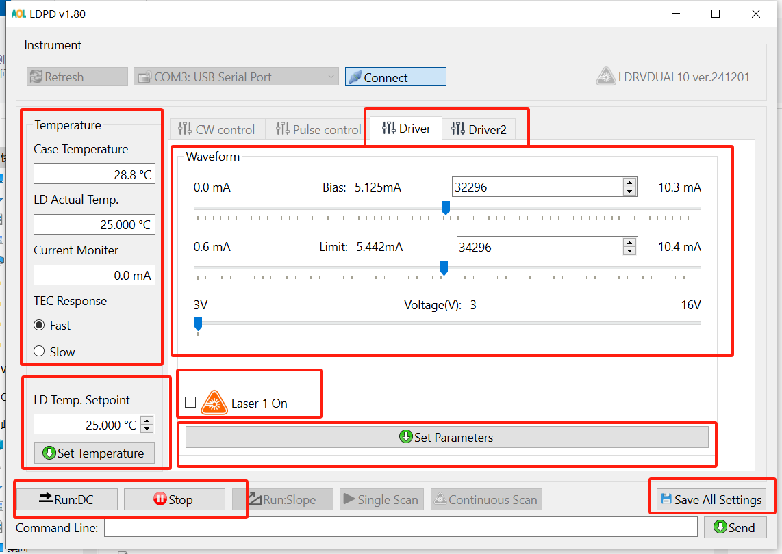 在Communication Port中找到对应的虚拟串口,若未找到,点击Refresh按钮。点击Connect按钮,正常连接后控制台变亮,并读取控制器的当前设定值。在LD Temp Setpoint输入需要的工作温度,点击Set Temperature设定。Bias滑动条设定恒定工作电流值,Limit滑动条设定Max. 限制电流。Driver(VCSEL)和Driver2(SOA)分别控制两通道的电流,设置参数后,点击下方的Set Parameters将参数发送至仪器。点击Save All Settings将所有参数保存在仪器中。