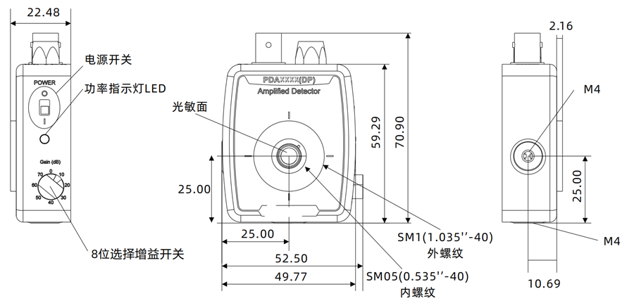 供电接口 | 供电开关 | 信号接口 | 增益调节 | 支杆接口 | 光学接口 | |||