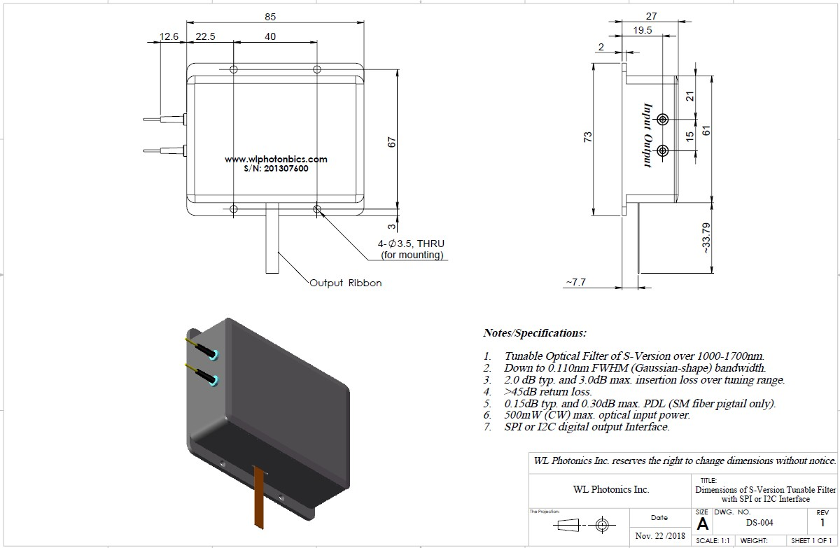 描述:S型光纤偏振不敏感电可调谐滤光器,带宽为0.35nm FWHM(高斯形状),超过1495-1605,尾纤端上有1M长、3.0mm OD松电缆SMF-28e光纤尾纤和FC/APC连接器。Max. 500mW(CW)光输入功率和USB接口。