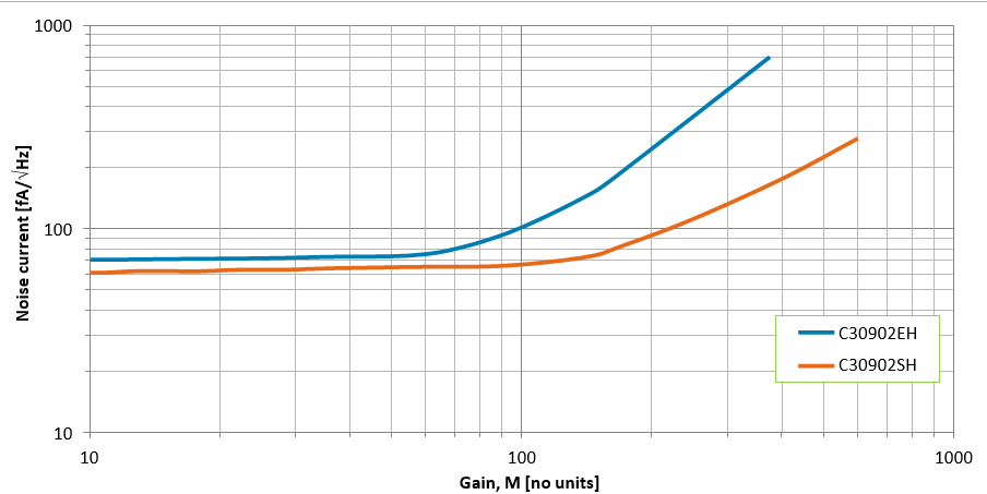 C30902SH和C30921SH均选用具有极低噪声和体暗电流的C30902EH和C30921EH光电二极管。它们适用于超微光级应用(光功率小于1 pW),可在增益高达250或更高的正常线性模式(Vr