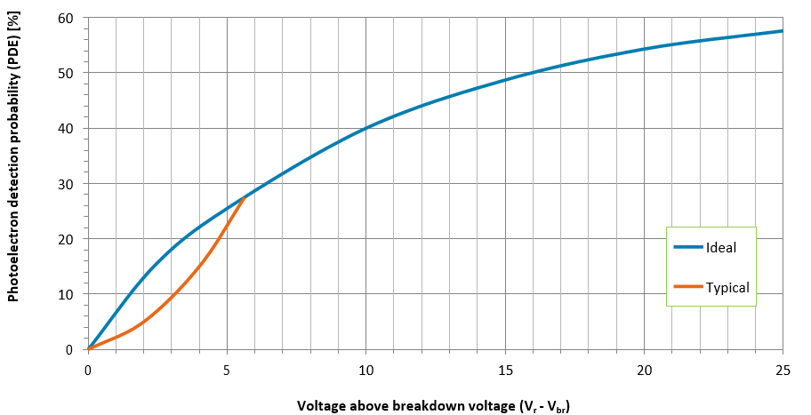 暗计数随着电压的增加而增加,其曲线与光电子检测概率相同,直到电压在脉冲后产生反馈机制,从而显著增加暗计数率。该最大电压取决于电路,除表1中列出的值外,不受保证。在大多数情况下,延迟时间为300纳秒,二极管可在高达Vbr+25V的电压下有效使用。