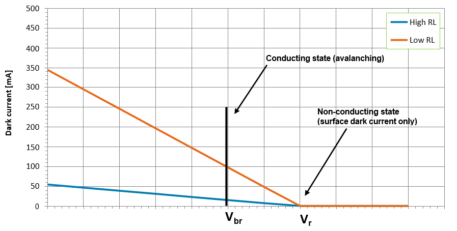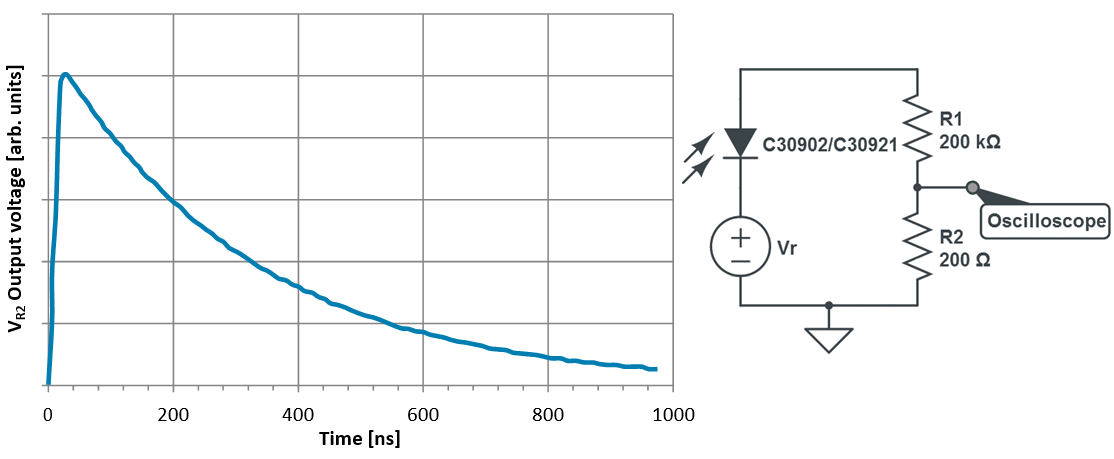 2.为了继续处于导电状态,必须有足够大的电流(称为闭锁电流ILATCH)通过器件,以便在雪崩区域始终存在电子或空穴。通常在C30902SH和C30921SH中,ILATCH=50A.对于远大于ILATCH的电流(Vr Vbr)/RL,二极管保持导通。如果电流(Vr Vbr)/RL远小于ILATCH,则二极管几乎立即切换到非导通状态。如果(Vr Vbr)/RL近似等于ILATCH,则二极管将在任意时间从导通状态切换到非导通状态,这取决于雪崩区域中的电子和空穴数量统计波动到零的时间。 当RL较大时,光电二极管正常导通,且在非导通状态下工作点位于Vr IDSRL。雪崩击穿后,该器件以时间常数RLC重新充电至电压Vr-IDSRL,其中C是包括杂散电容在内的总器件电容。使用C=1.6 pF和RL=200 k 充电时间常数为0.32s是计算出来的。上升时间很快,为5到50ns,随着Vr-Vbr的增加而减少,并且非常依赖于负载电阻器、引线、电容器的电容,