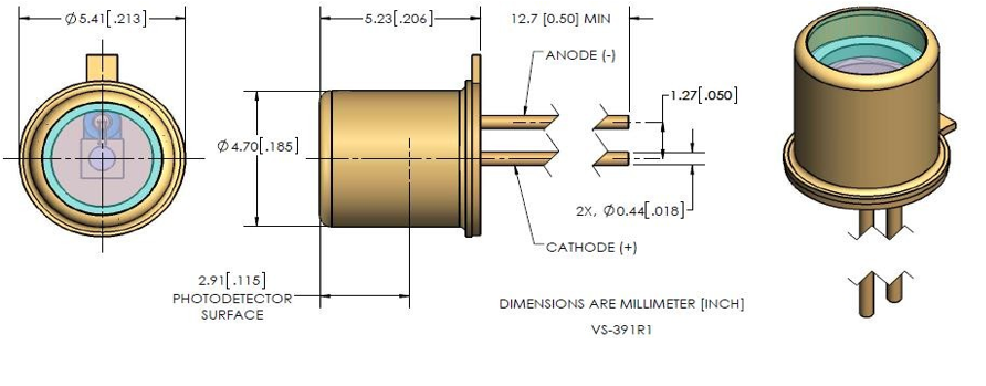 C30921EH封装在TO-18光管中,该光管允许从聚焦点或直径高达0.25 mm的光纤将光有效耦合到探测器。密封的TO-18封装允许光纤与光管端部匹配,以最大限度地减少信号损失,而无需担心危及探测器稳定性。C30902EH-2或C30902SH-2(带内置905nm通带滤波器的密封TO-18封装)和C30902BH(带密封球透镜)构成了C30902系列。
