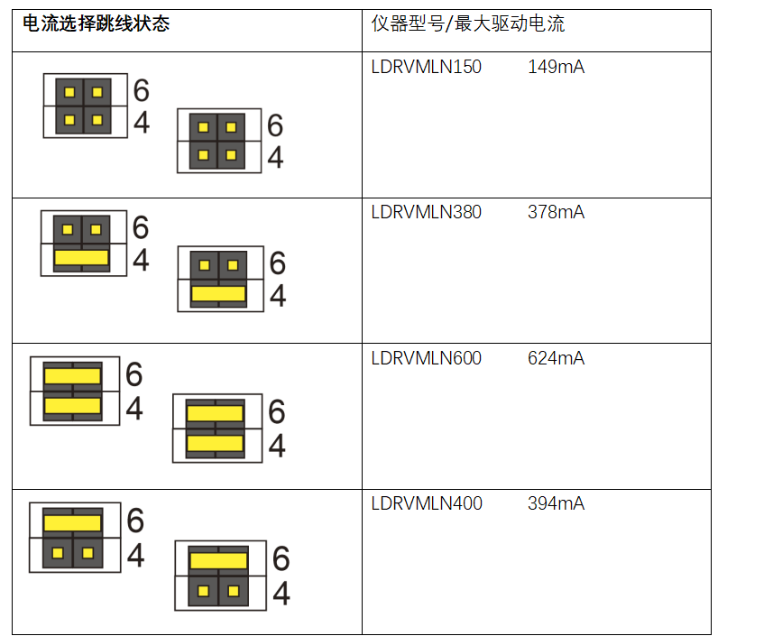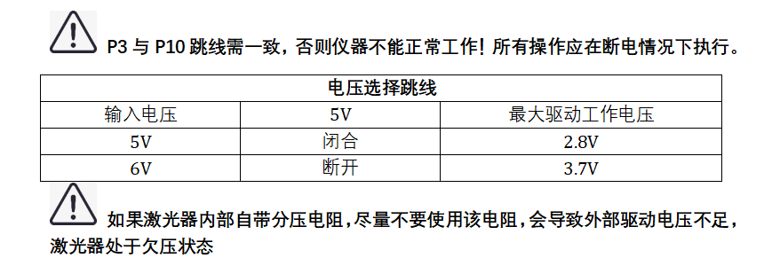 请将LDRVMLN的Max. 驱动电流设置为等于或稍大于激光的Max. 允许电流。如果将驱动电流设置过大,将增加激光器烧毁的风险。设置由电路板上P3、P10跳线: