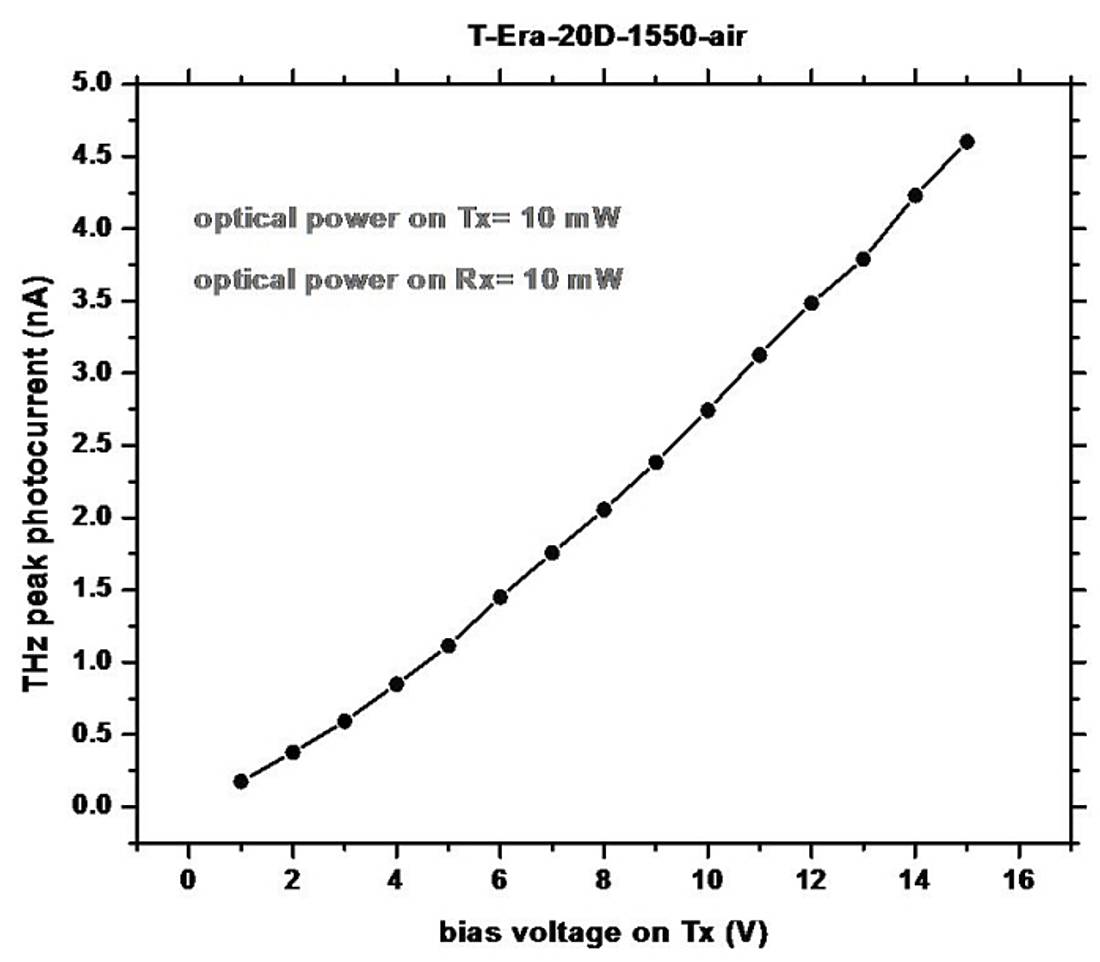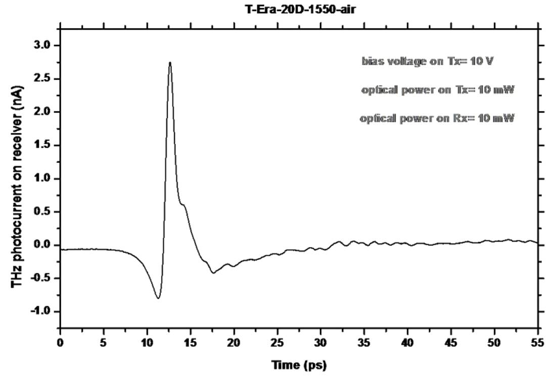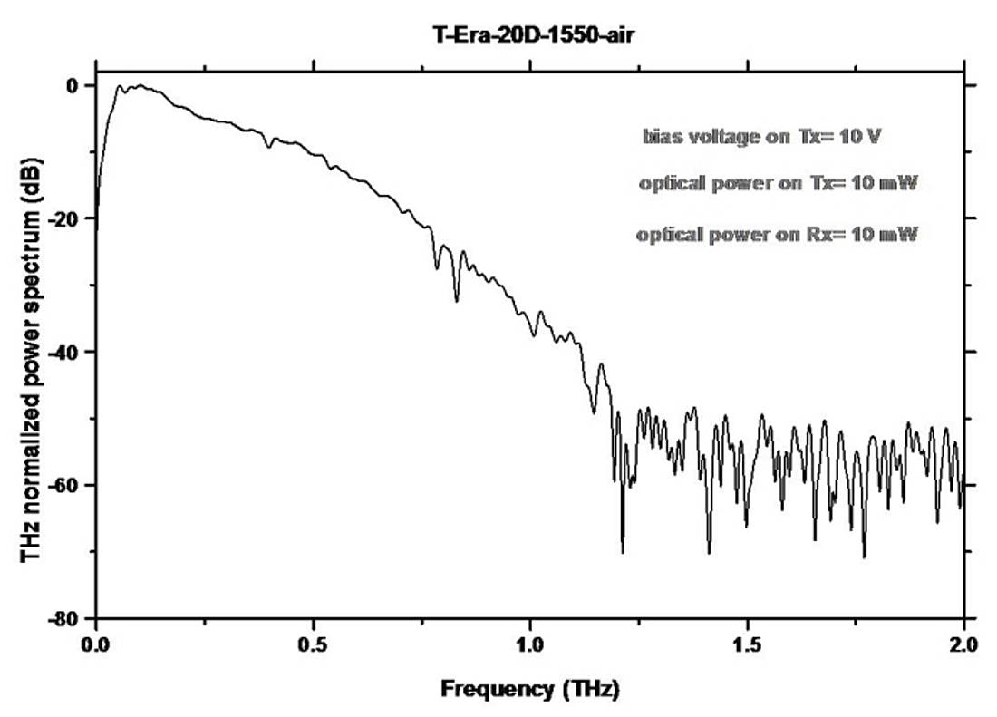 在太赫兹时域系统中,T-Era-20D-1550-Air发射器模块生成并由T-Era-20D-1550-Air接收器模块检测到的典型THz脉冲及其相应的功率谱。一对T-Era-20D-1550-Air THz-PCA受到平均频率为15 mW的100 fs光脉冲的激励,在接收天线上产生4.5 nA峰值太赫兹光电流,其动态频谱范围超过60dB太赫兹。