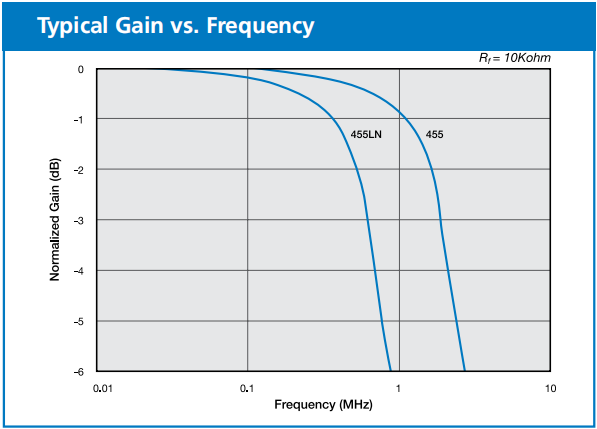 然而,所需的频率响应受到运算放大器增益带宽乘积(GBP)的限制。为了获得稳定的输出,必须选择RF和CF值,使检波器/前置放大器组合的3dB频率响应小于运算放大器的Max. 频率,即f3dB≤fmax。