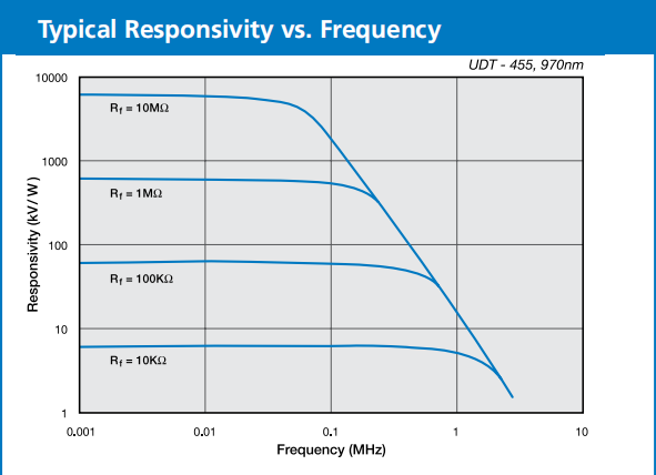 光电二极管/放大器组合的频率响应由光电探测器、前置放大器以及反馈电阻(RF)和反馈电容(CF)的特性决定。对于已知增益(RF),检波器/前置放大器组合的3dB频率响应如下所示: