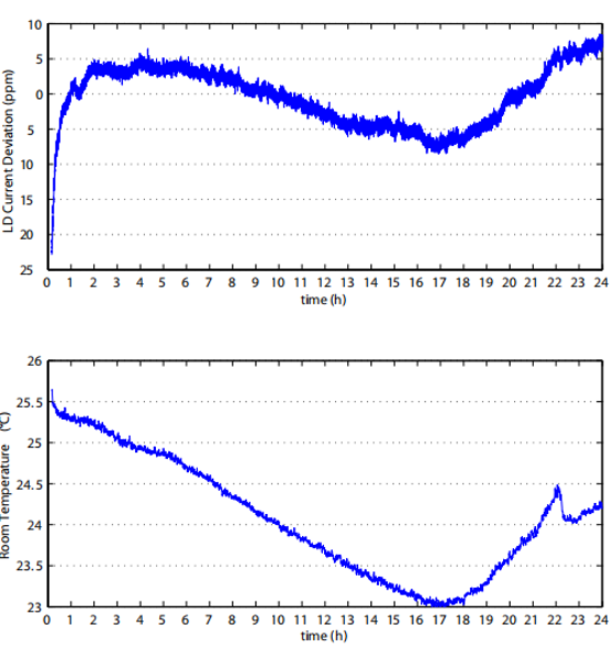 下图显示了LDC500系列的温度性能。在24小时内,实验室中的环境温度变化超过了2摄氏度。请注意,预热后LDC的输出电流偏差稳定,优于±10ppm