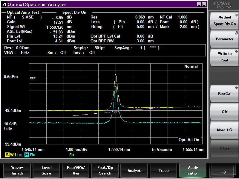 3 , 将准备输入SOA的种子光控制在1mW左右,插入Fiber Fix。再用一根光纤跳线连接Fiber Out,另一端连接在光功率计上观察,此时SOA内部还没有电流,种子光不会被放大,但功率计上可能会观测到微弱的种子光功率。