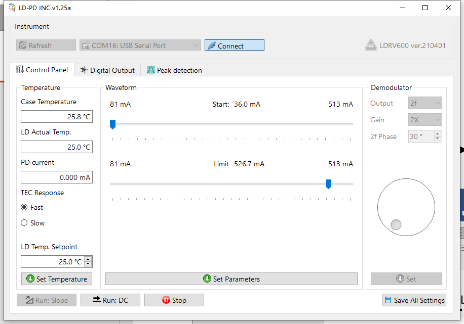 2, 打开PC端SOA驱动程序,按下Connect连接SOA驱动设备。观察到右上角出现设备型号,连接成功。观察LD Actual Temp温度和LD Temp Setpoint温度一致,说明温控正常工作。修改LD Temp Setpoint温度值,按下Set Temperature可以更改SOA工作温度,但一般情况下25℃即可。如下图: