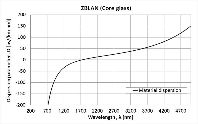 ZBLAN玻璃的材料分散性(芯,典型)