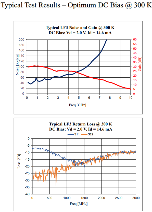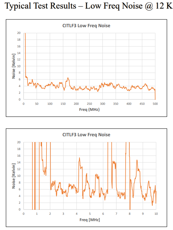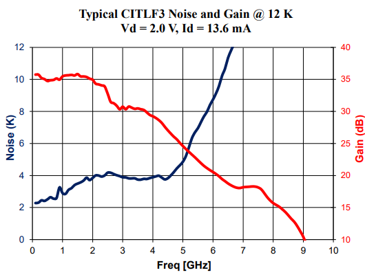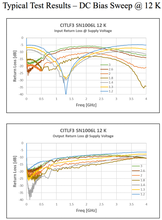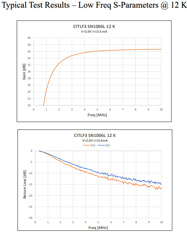 CITLF3 是一种硅锗 (SiGe) 低噪声低温放大器,用于射电天文学和量子物理应用。当冷却至 12K 或更低时,该放大器在 0.01GHZ 至 4GHz 的频率范围内实现了 4K (0.06dB) 的平均噪声温度。100 MHz 时的最低噪声温度为 2.5K。典型增益为 33dB,输入/输出回波损耗小于 -10dB。放大器是无条件稳定的。虽然放大器最适合 0.01 GHz 至 4 GHz 的频率范围,但该放大器可用于 3 MHz 至 5 GHz。 该放大器由单个正直流电源供电,最佳电压为 2.0 V。此偏置下的功耗为 27 mW。然而,在低至 5 mW 的功耗下可以接收到良好的噪声温度。低功耗非常适合以 4K 运行的多放大器阵列。 放大器为 20.7 mm x 15.9 mm x 8.7 mm,不包括连接器。输入和输出母头 SMA 连接器。包含多型号