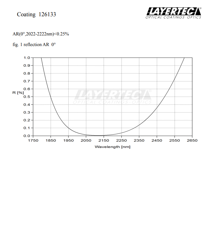 类别 高反射 High Reflectance 偏振 unpol. 入射角 0° 波长范围 2022 - 2222 nm 高反射 > 99.99 % | 类别 减反射 Anti-Reflectance 偏振 unpol. 入射角 0° 波长范围 2022 - 2222 nm AR / HT < 0.25 % |