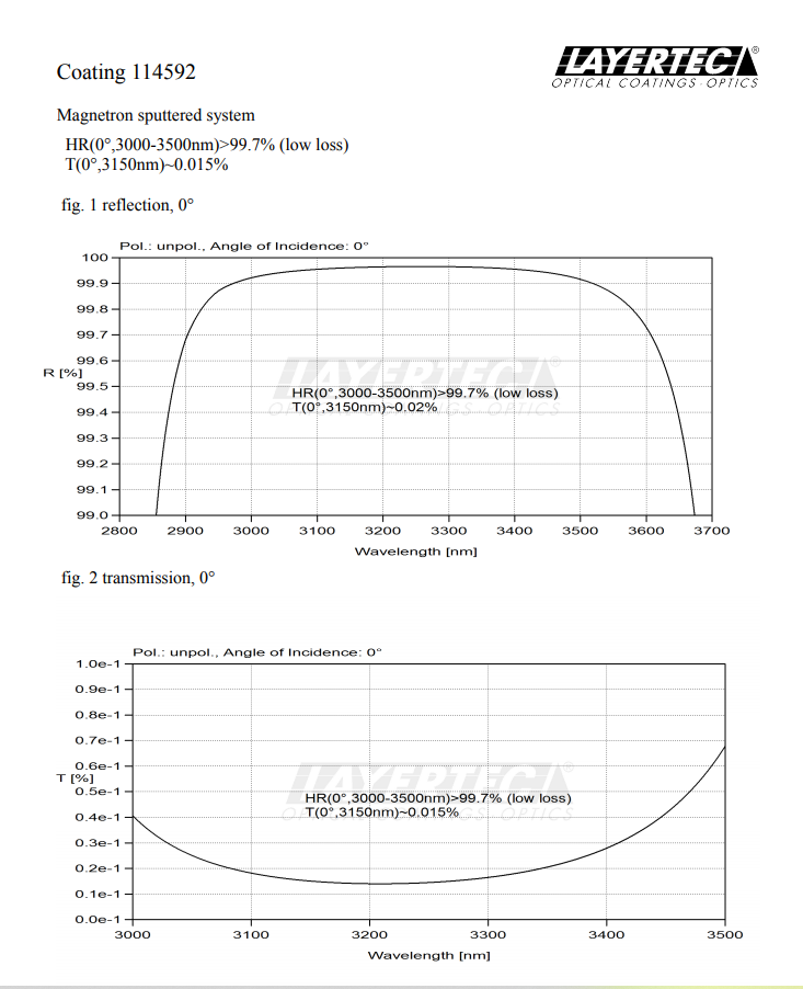 1st 工作范围 HR(0°,3000-3500nm)>99.7% | 1st 工作范围 AR(0°,3000-3500nm)<0.25% |