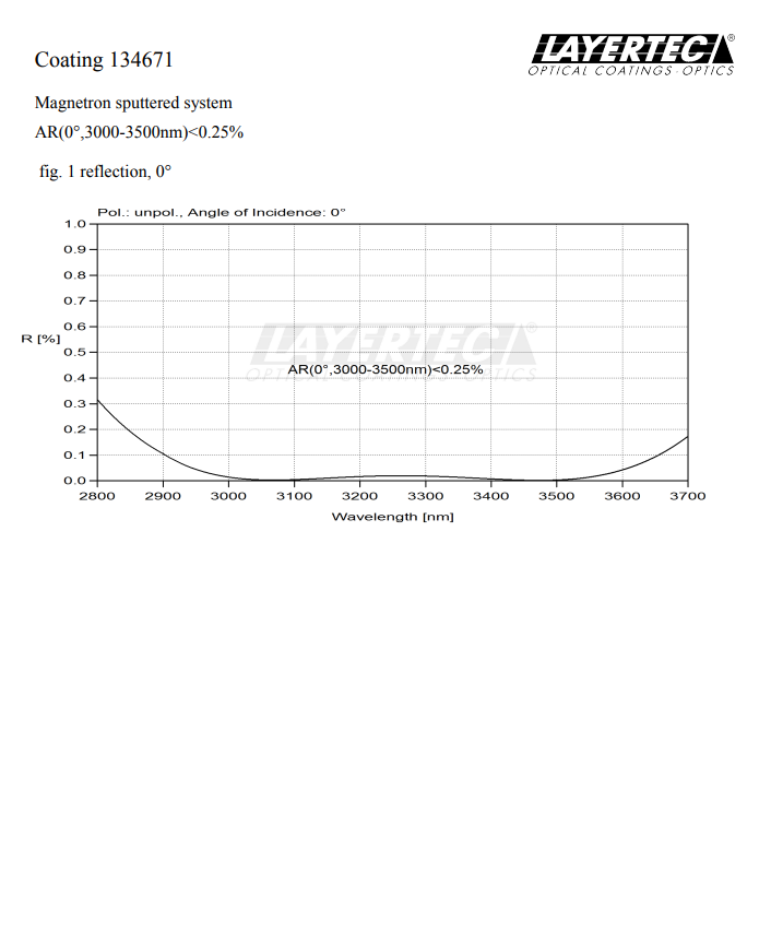 类别 部分反射 偏振 unpol. 入射角 0° 波长范围 3000 - 3500 nm 高反射 > 99.7 % | 类别 减反射 Anti-Reflectance 偏振 unpol. 入射角 0° 波长范围3000-3500nm AR / HT < 0.25 % |
