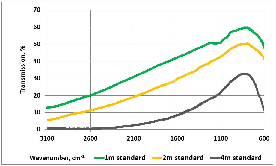 不同长度多晶光纤的透射光谱(标准质量等级)