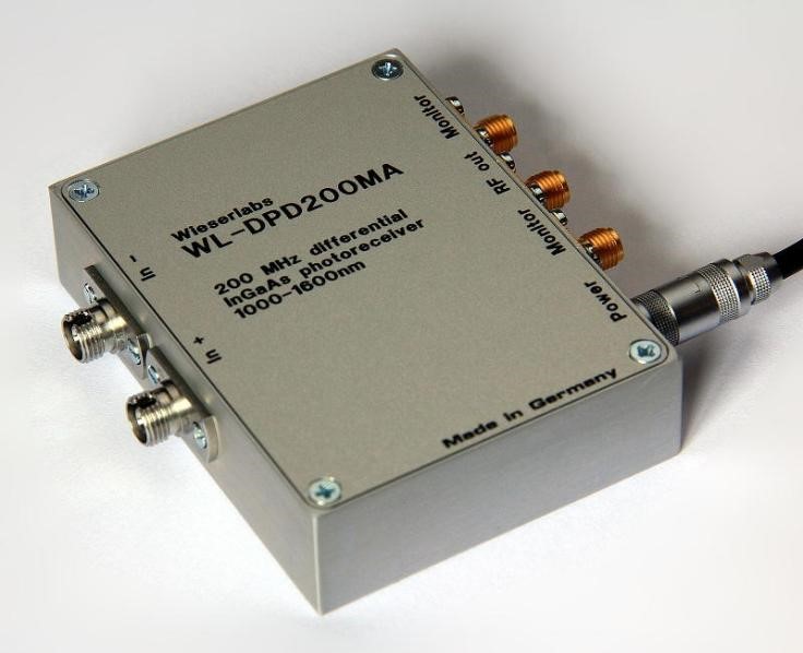 高跨阻增益: 7500 V/W (1550nm) 带宽:200 MHz 直流耦合 2个显示器输出(未校准) 波长范围:1000nm至1700nm 光纤耦合:光纤通道接收器 输出: 50 Ω SMA插头 宽范围单电源:11至15 V
