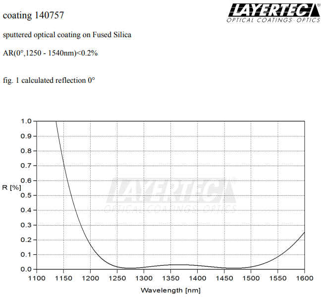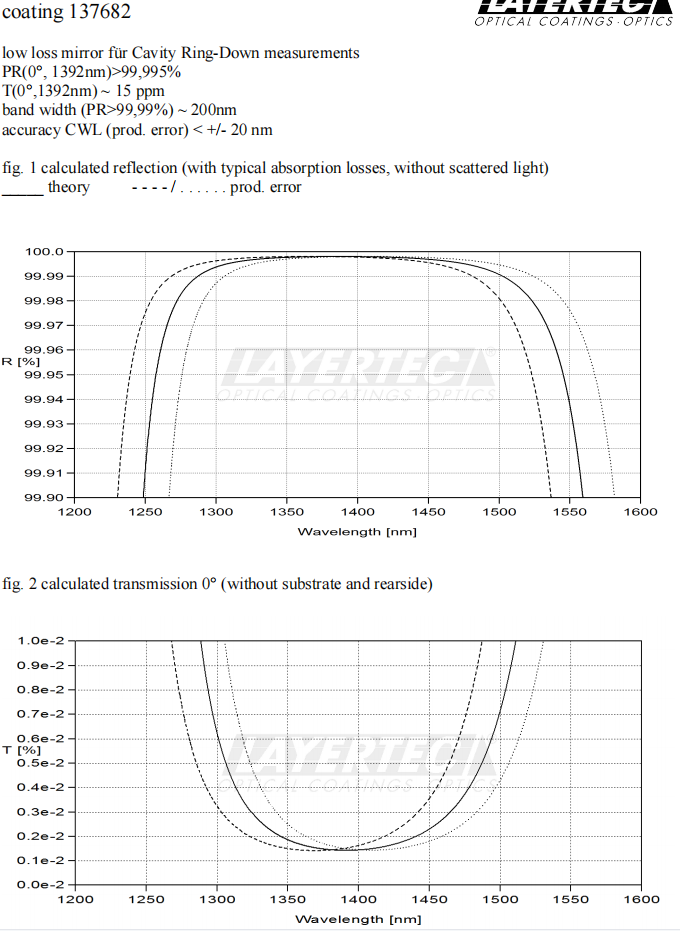 1st 工作范围 高反射 HR(0°,1392nm)>99.995% | 1st 工作范围 AR(0°,1250-1540nm)<0.2% |