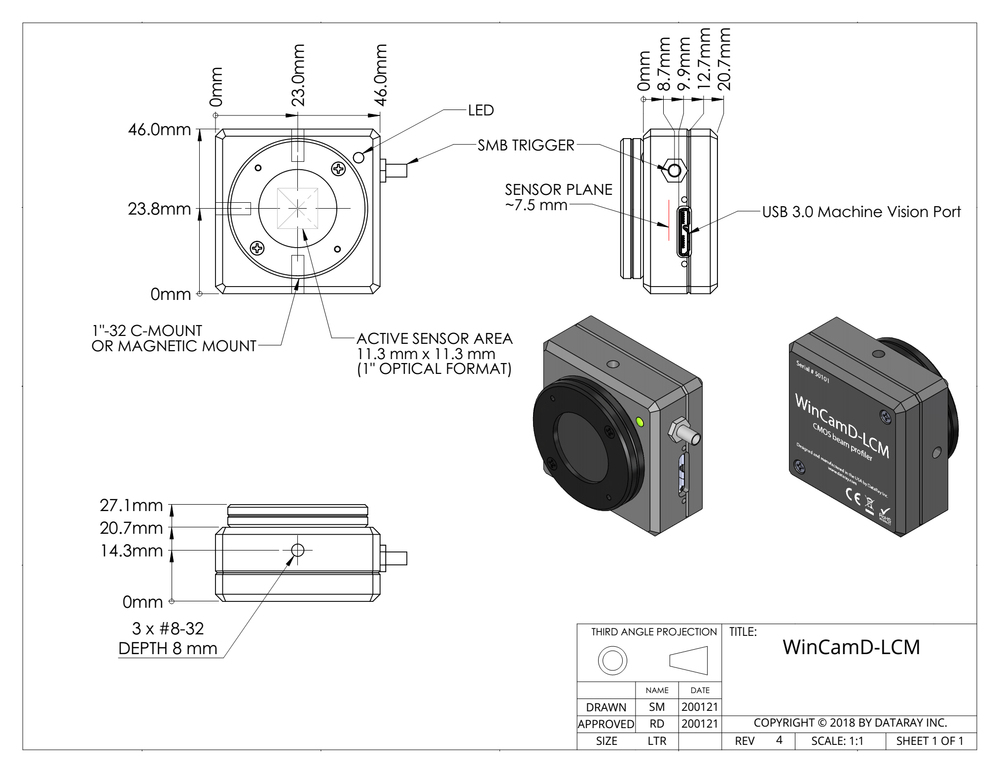 1”CMOS 光束分析照相机,超高速USB 3.0,190-1605nm,有效面积11.3×11.3 mm,4.2 MP,5.5×5.5 μm像素点,光和电双触发的全局快门,频率更新至60Hz,WinCamDTM-LCM系列是连续和脉冲激光光束分析的理想工具。新的高分辨CMOS探测器意味着无拽尾,快门和触发选项使脉冲捕获简单化。LCM系列配备DataRay功能齐全,可定制,以用户为中心的软件,软件可免费更新,许可证无需付费,并提供无限制的软件安装。