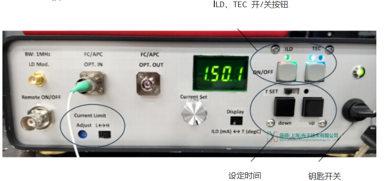 - 按 ILD、TEC 开/关按钮。 按钮上方的 LED(红色和绿色)亮起,开始控制 LD 和 TEC 电流。