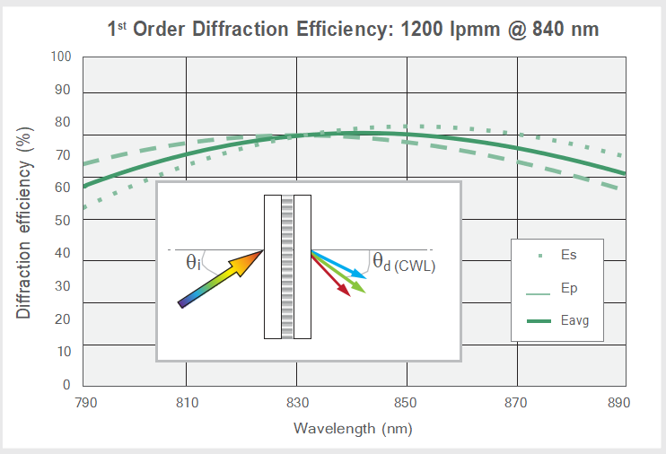 中心波长:840 nm;尺寸:35 x 45 mm ;厚:3.00 ± 0.25 mm; 空间频率(线/mm):1200 l/mm +0/-0.5 l/mm; 工作范围:700 - 960 nm; 入射角(θ):30.2° @ 840 nm;