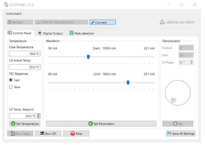 在Communication Port中找到对应的虚拟串口,若未找到,点击Refresh按钮。点击Connect按钮,正常握手后控制台变亮,并读取控制器的当前设定值。在LD Temp Setpoint输入需要的工作温度,点击Set Temperature设定。Start滑动条设定恒定工作电流值,Limit滑动条设定Max. 限制电流。点击下方的Set Parameters将参数发送至仪器。点击Save All Settings将所有参数保存在仪器中。
