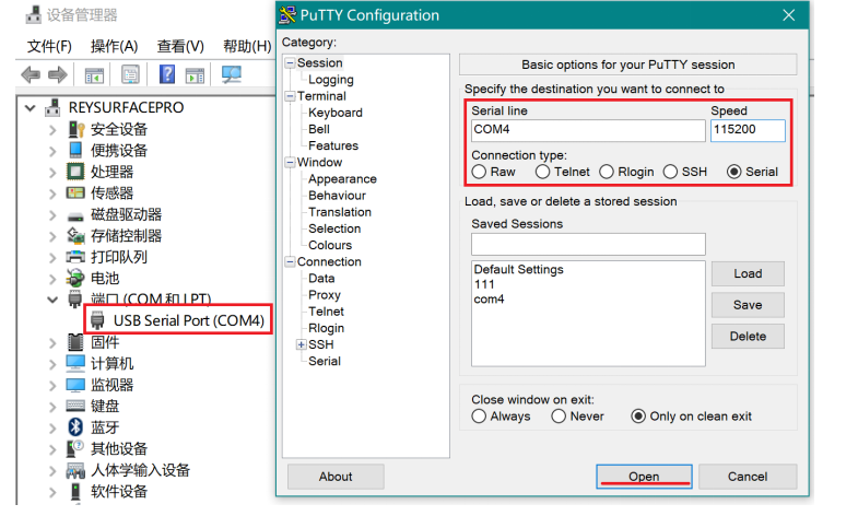 以下以PuTTY为例说明通讯方法。打开PuTTY后,连接选择Serial,输入与设备管理器中一致的端口号,Speed中输入115200,点击open即可打开黑色的交互端口,通过键盘输入相关指令即可(Backspace按键无效)。正确输入命令后系统会有提示设置结果,错误会返回error信息。