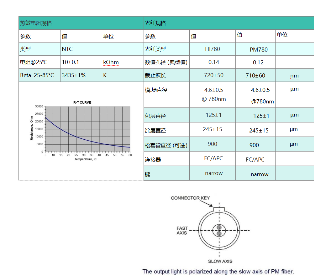 增益最大为 780nm 时增益为 40dB,增益带宽为 16nm,HI-1060 光纤 增益最大为 780nm 时增益为 40dB,增益带宽为 16nm,PM-980 光纤,带松套管