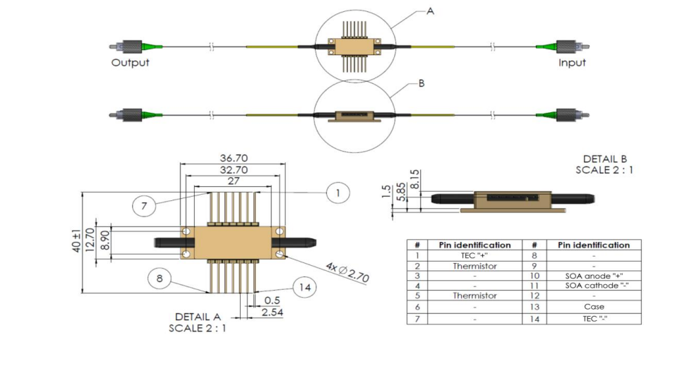 SOA0780016PM40DBLXXX -> 增益Max. 为 780nm 时增益为 40dB,增益带宽为 16nm,PM-980 光纤,带松套管