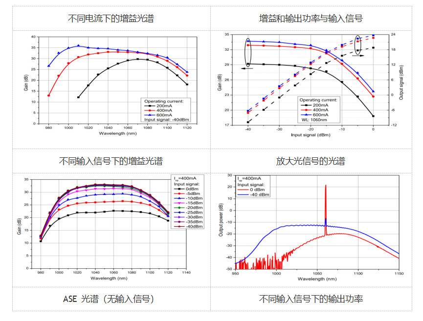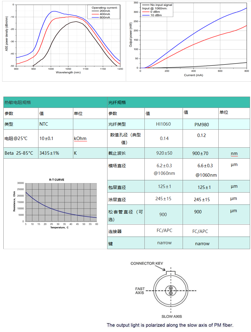 增益平均波长 1060nm,增益带宽 90nm,增益波长最大时增益 30dB,HI-1060 光纤; 增益平均波长 1060nm,增益带宽 90nm,增益波长最大时增益 30dB,PM-980 光纤,带松套管