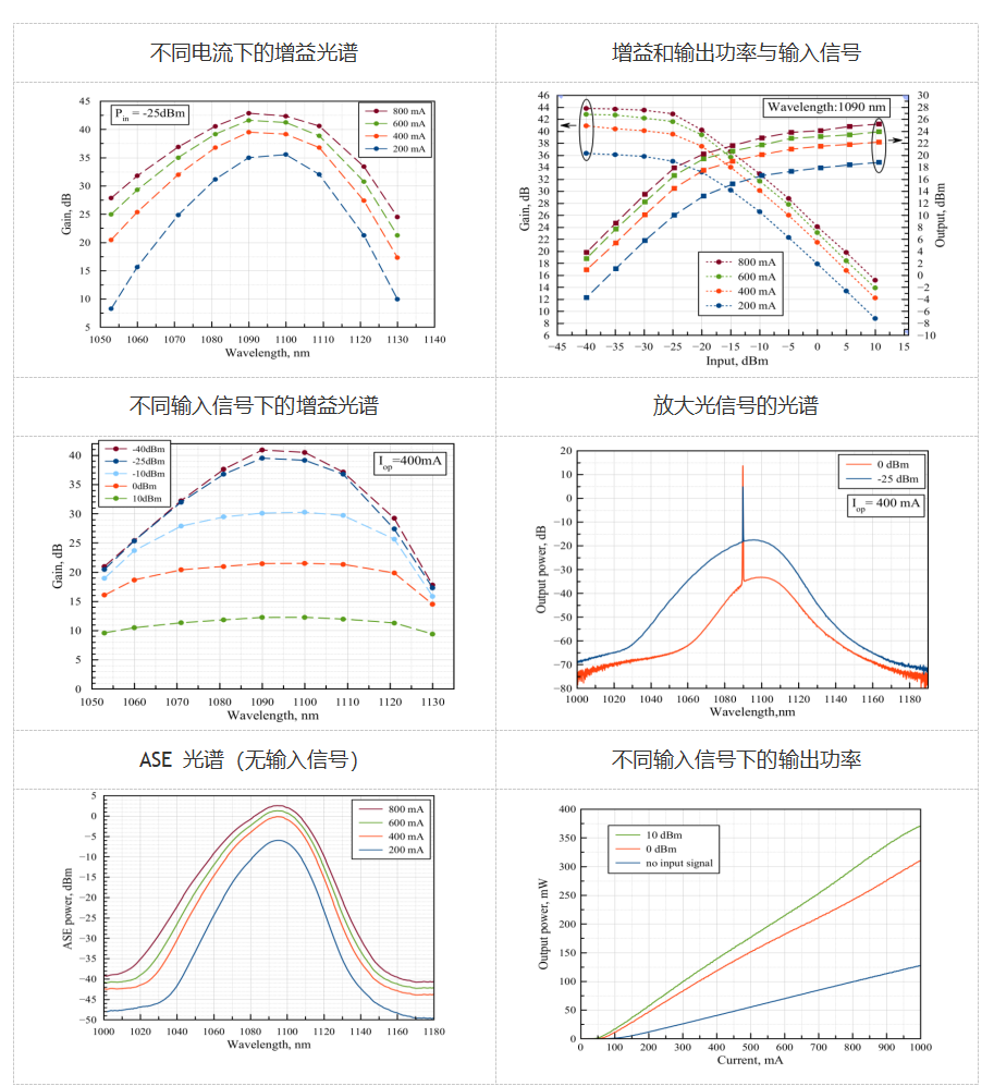 增益最大为 1090nm 时增益为 40dB,增益带宽为 25nm,HI-1060 光纤;增益最大为 1090nm 时增益为 40dB,增益带宽为 25nm,PM-980 光纤,带松套管