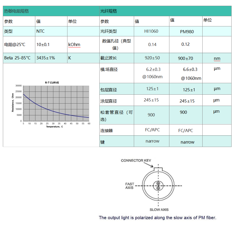 • 保偏PM980光纤或HI1060光纤
