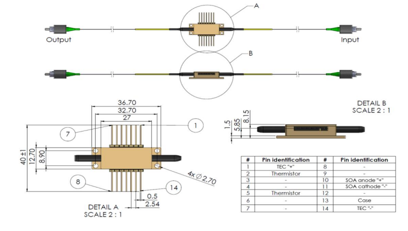 SOA1090025PM40DBLXXX -> 增益Max. 为 1090nm 时增益为 40dB,增益带宽为 25nm,PM-980 光纤,带松套管