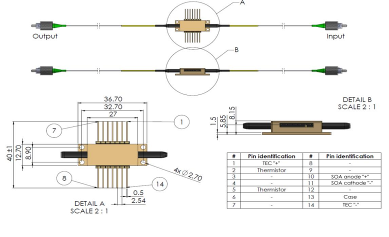 SOA1125025PM35DBLXXX -> 1125nm 增益Max. 值和 25nm 增益带宽时增益为 35dB,PM-980 光纤,带松套管