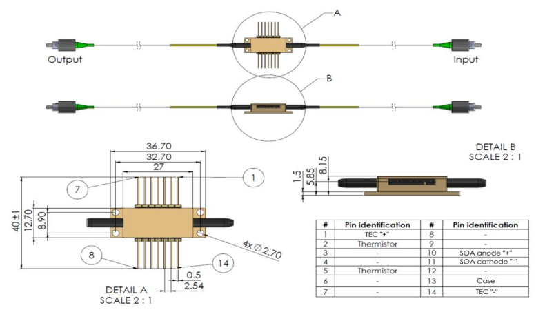 SOA1250110PM27DBLXXX -> 1250nm 增益平均波长,110nm 增益带宽,增益Max. 波长处增益为 27dB,PM-980 光纤,带松套管