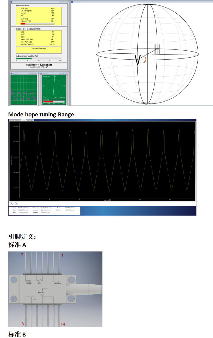 1036nm 14PIN蝶形封装DFB激光器、内置TEC、透镜、热敏电阻、PD集成在14PIN蝶式封装中。气密设计满足电信等级工作要求,具有线宽窄,功率高(50mW)可以支持尾纤PM980或者HI1060光纤输出,同时支持客户指出引脚定义定制。