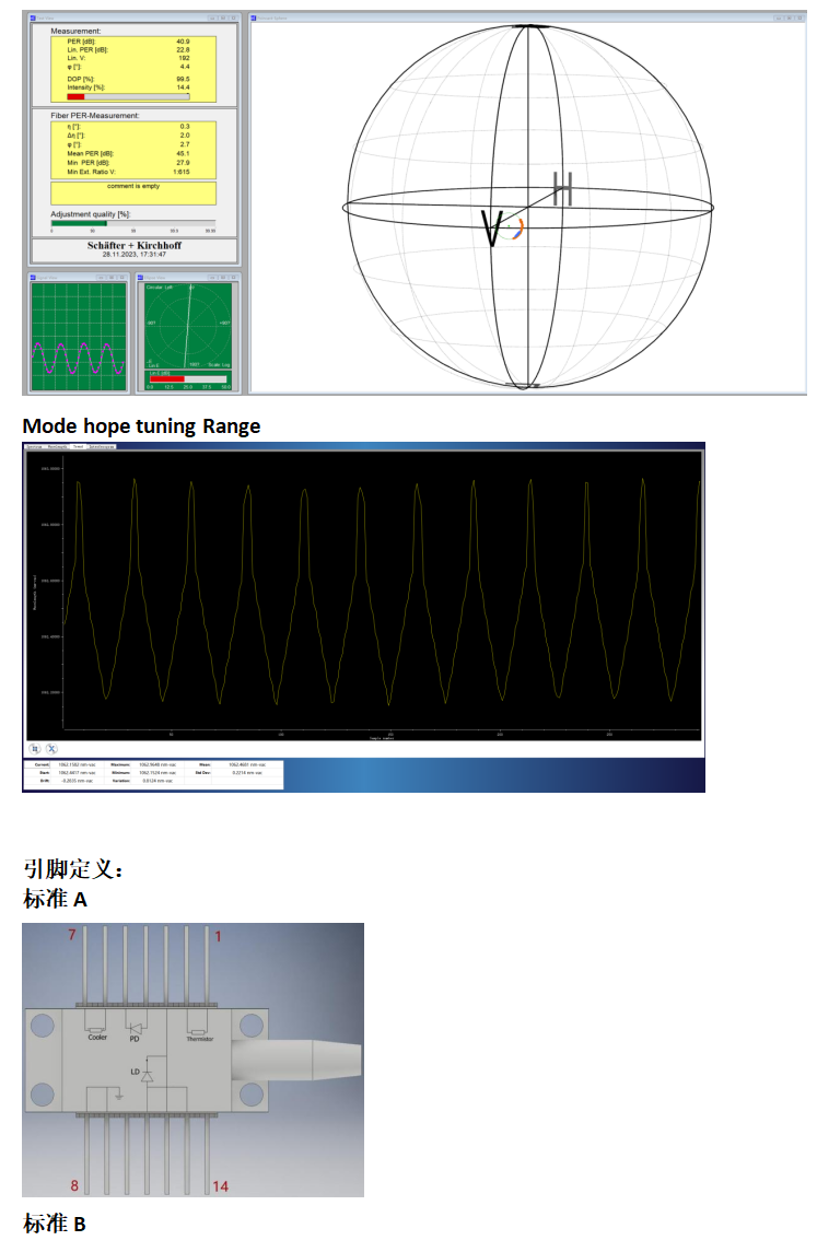 1060nm 14PIN蝶形封装DFB激光器、内置TEC、透镜、热敏电阻、PD集成在14PIN蝶式封装中。气密设计满足电信等级工作要求,具有线宽窄,功率高(50mW)可以支持尾纤PM980或者HI1060光纤输出,同时支持客户指出引脚定义定制。