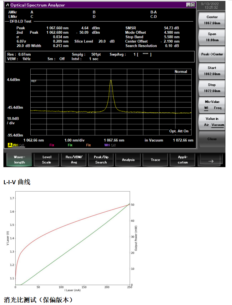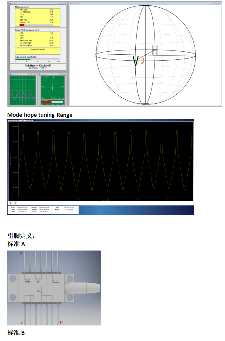 1068nm 14PIN蝶形封装DFB激光器、内置TEC、透镜、热敏电阻、PD集成在14PIN蝶式封装中。气密设计满足电信等级工作要求,具有线宽窄,功率高(50mW)可以支持尾纤PM980或者HI1060光纤输出,同时支持客户指出引脚定义定制。