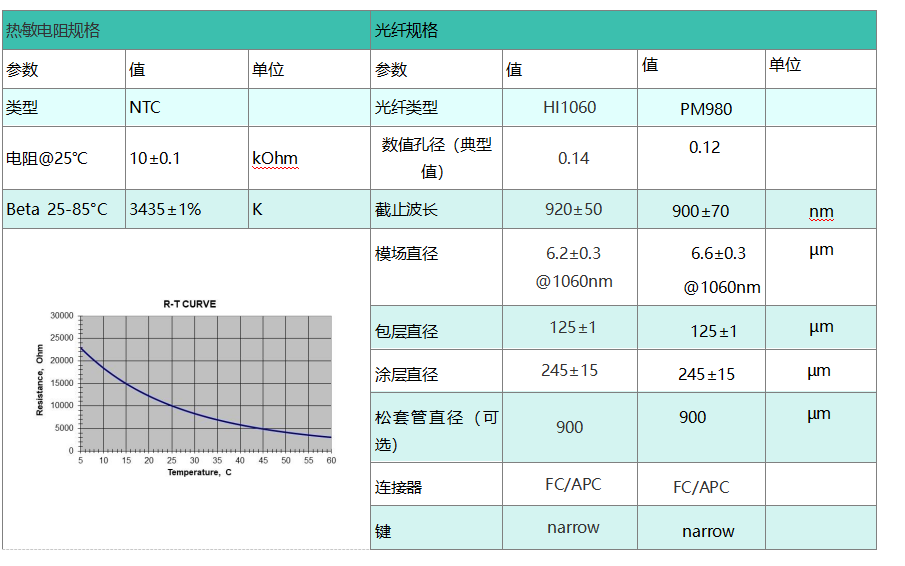 • 保偏 PM980(PM1300 可选)光纤或 HI1060 光纤